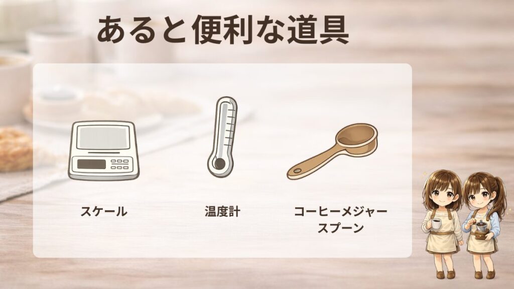 最初の3つ(ドリッパー+フィルター/ケトル/ミル)が揃ったら、次は「味を安定させる道具」があるとラクになります。