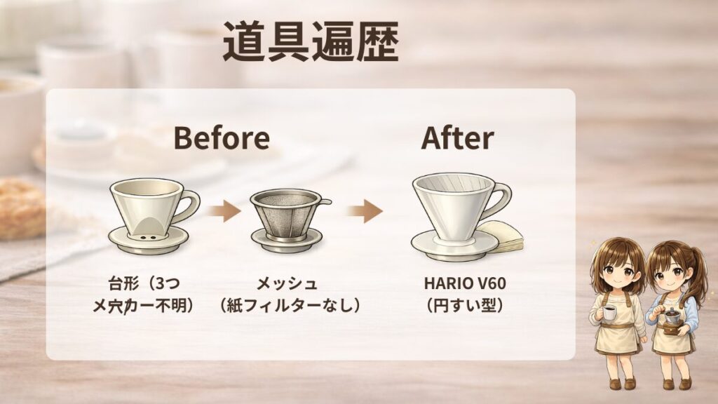 私自身も、家にある道具から始めて、合わないものはやめたり変えたりしながら、半年くらいでハリオV60に落ち着きました。