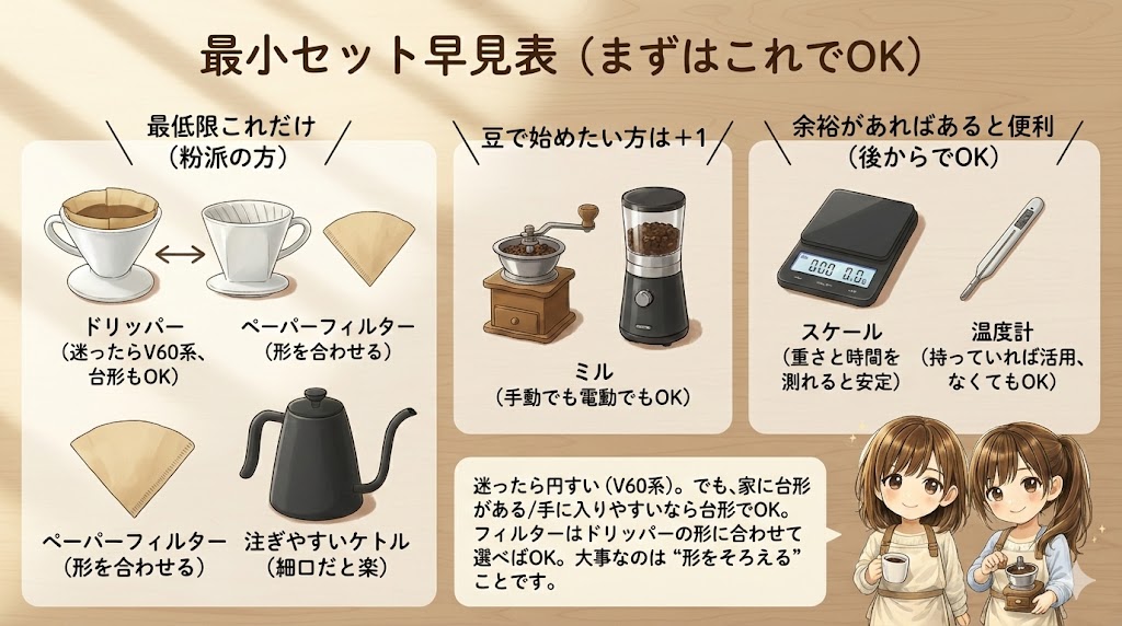 そこでこの記事では、初心者の私が「まずはこれだけでOK」と思った最小セット3つ(ドリッパー+フィルター/注ぎやすいケトル/豆派ならミル)を、できるだけ分かりやすくまとめました。